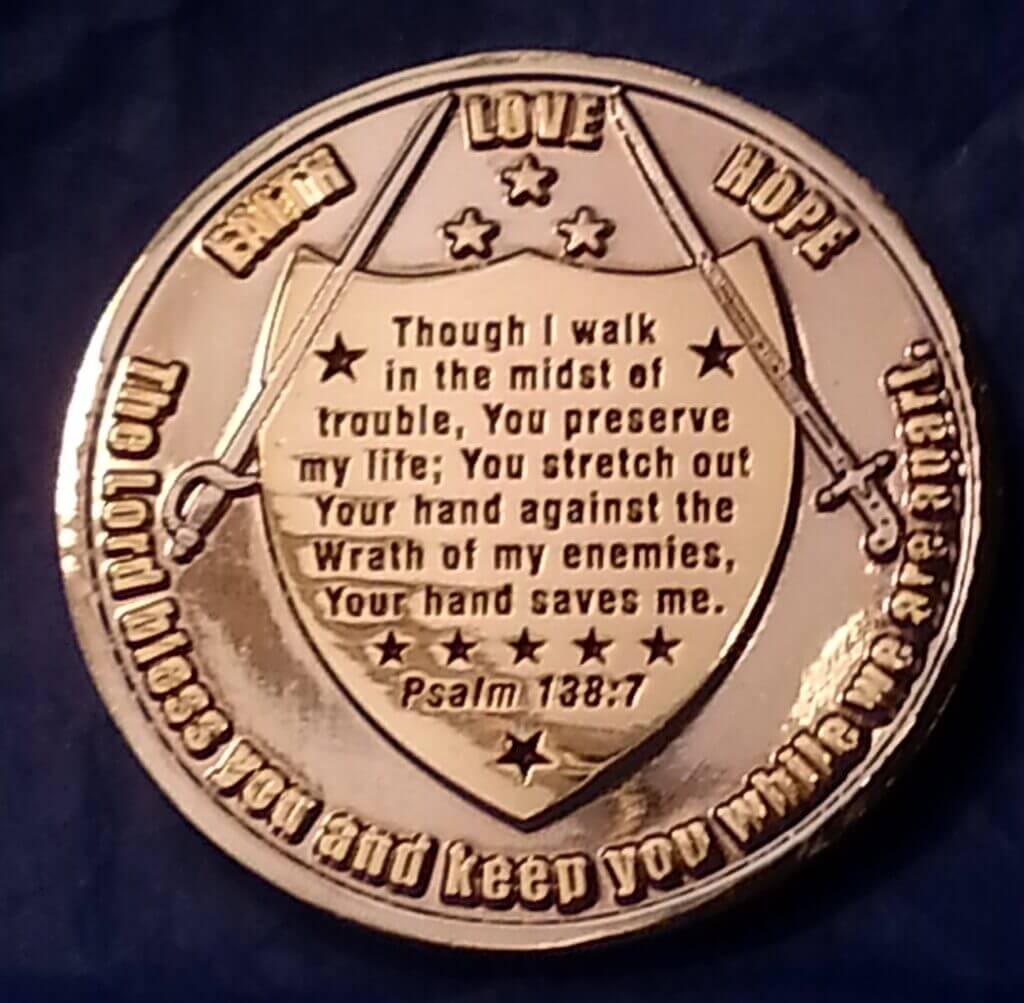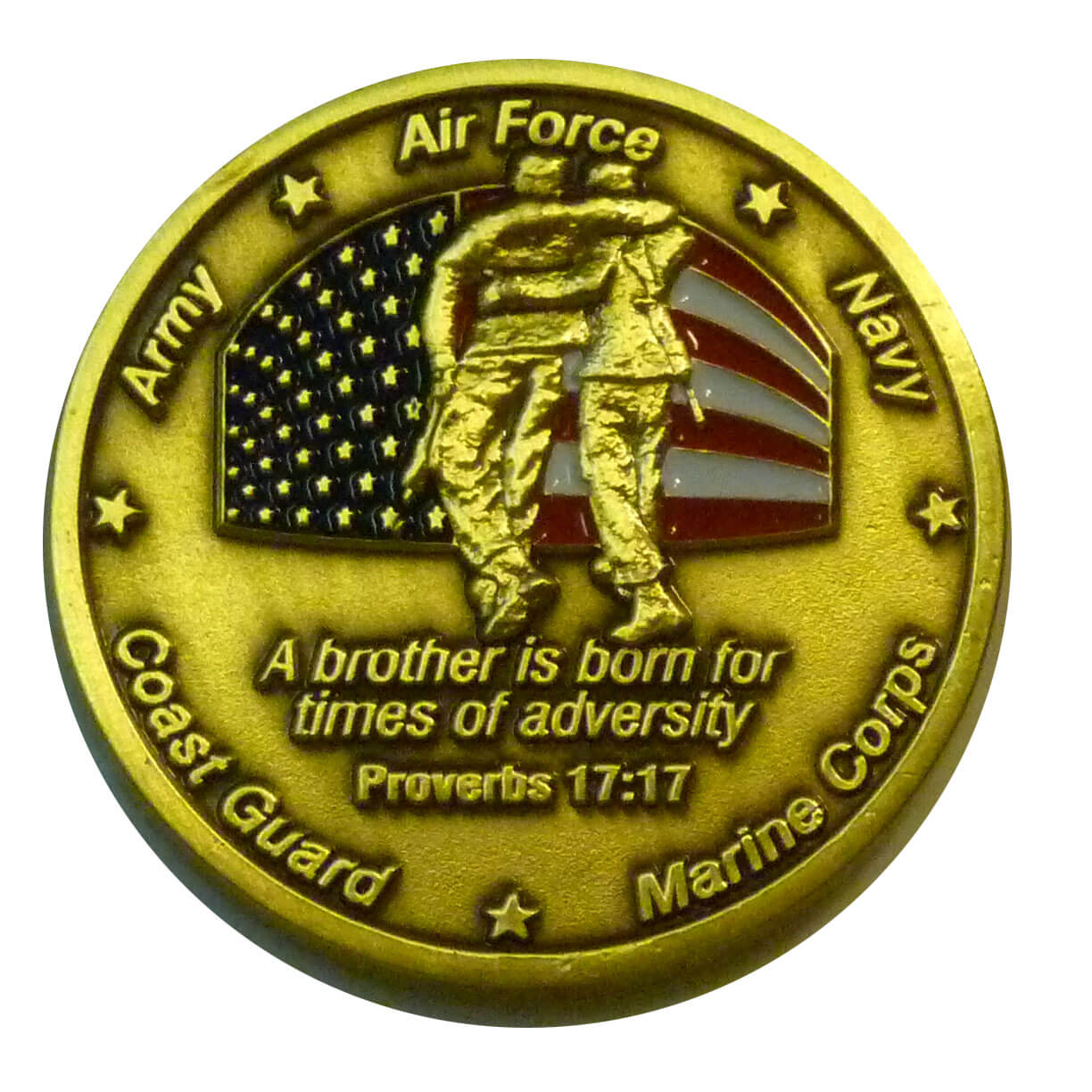 These coins honor the brotherhood and comradery of our military.The back says: "A brother is born for times of adversity"…